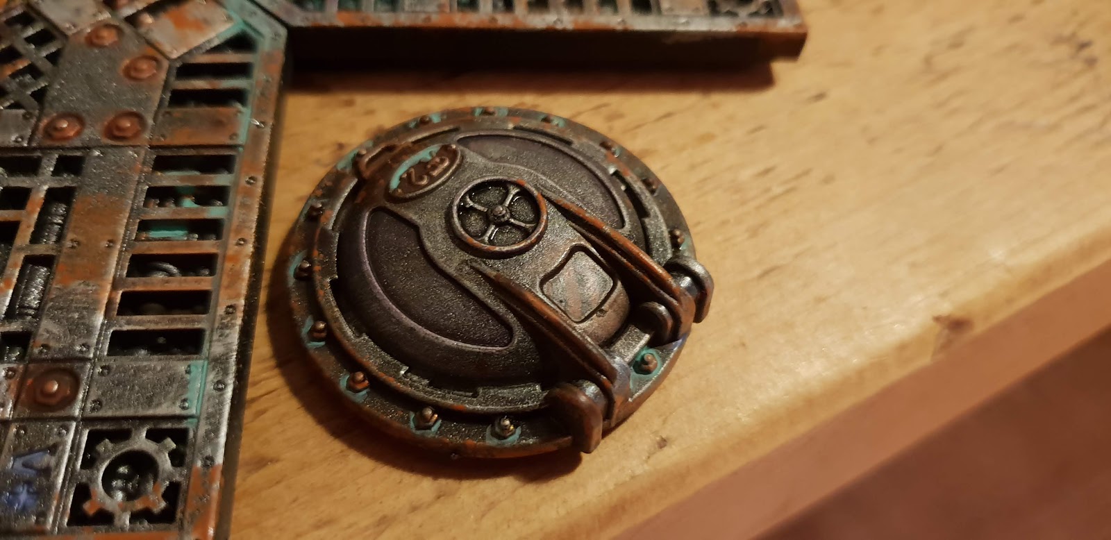 These, coupled with some leftover MDF discs raised the height to a uniform level. By gluing (that didn't work) and then screwing in the caps to the underhive tiles, I managed to make them swap-able and the same height as the existing Mortalis tiles from FW.